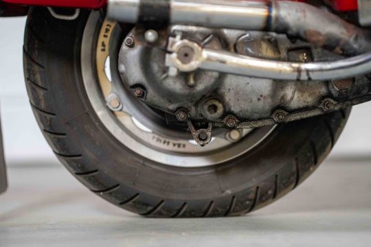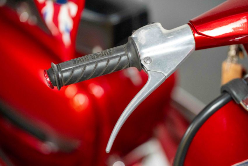The red paintwork presents very well for its age, with only light age-related patina in places — consistent with careful ownership and sympathetic storage. The black seat is clean and free from major wear or damage, while the wheels and running gear show signs of minimal use.