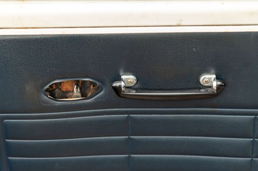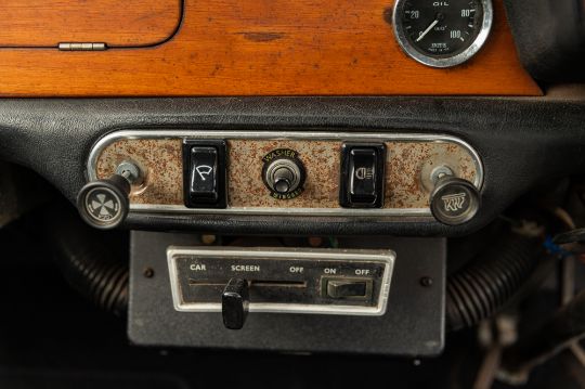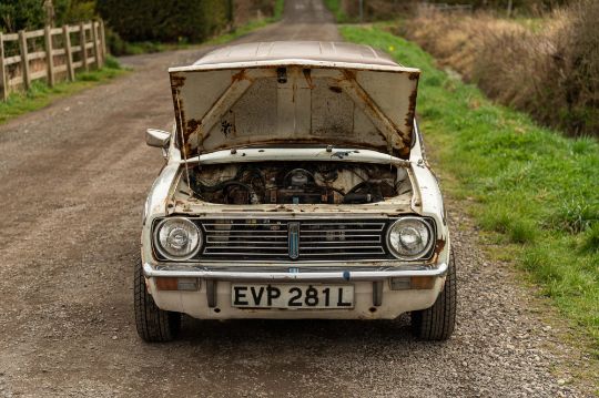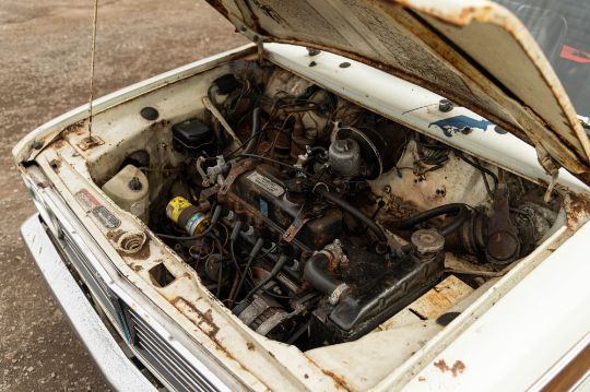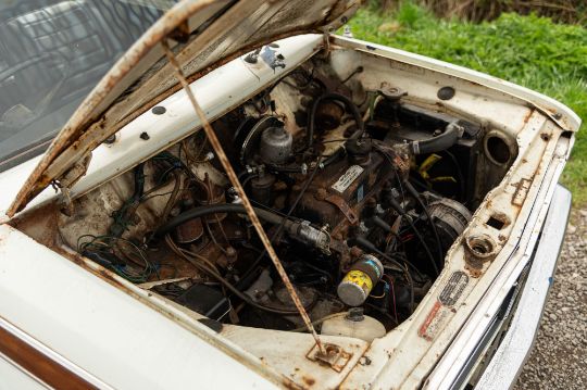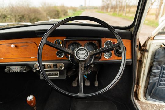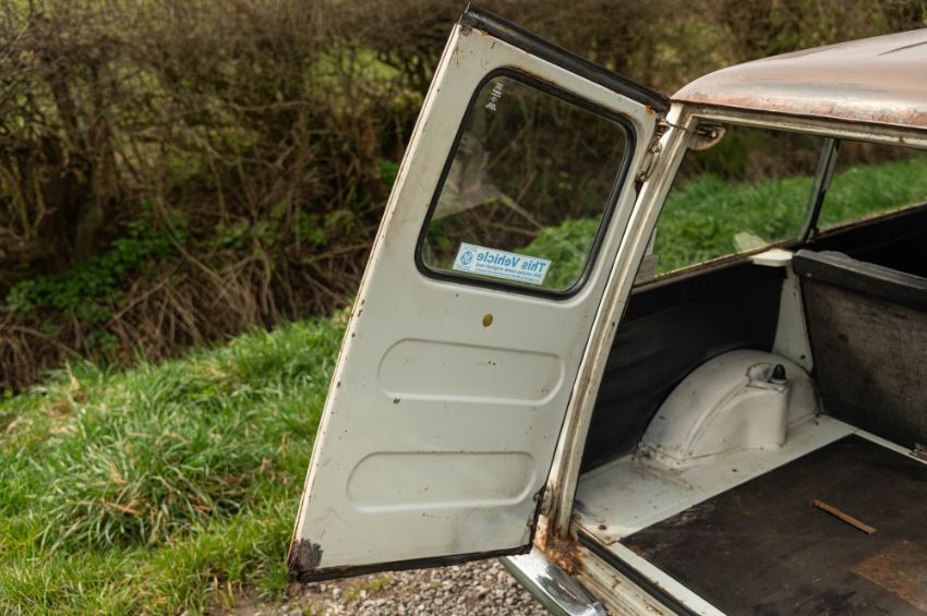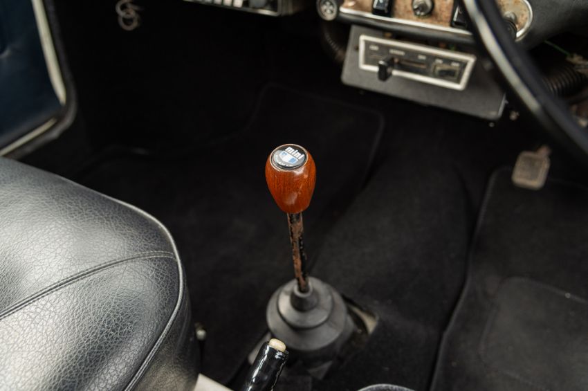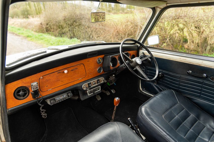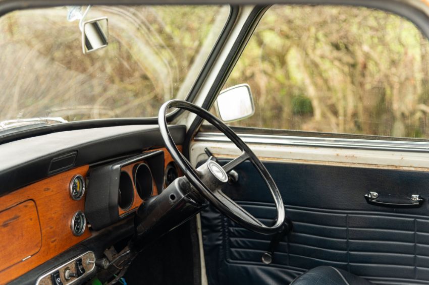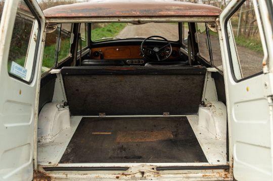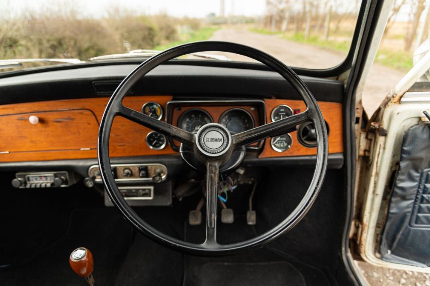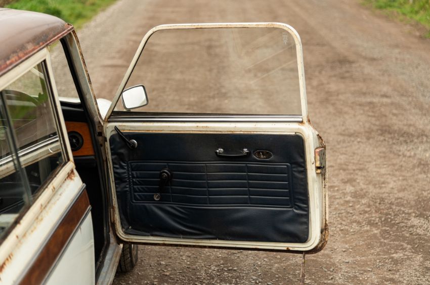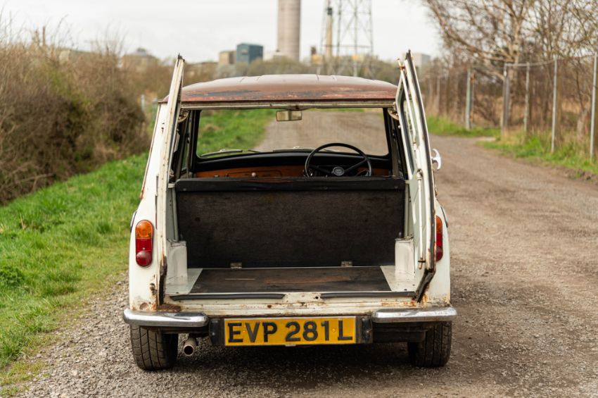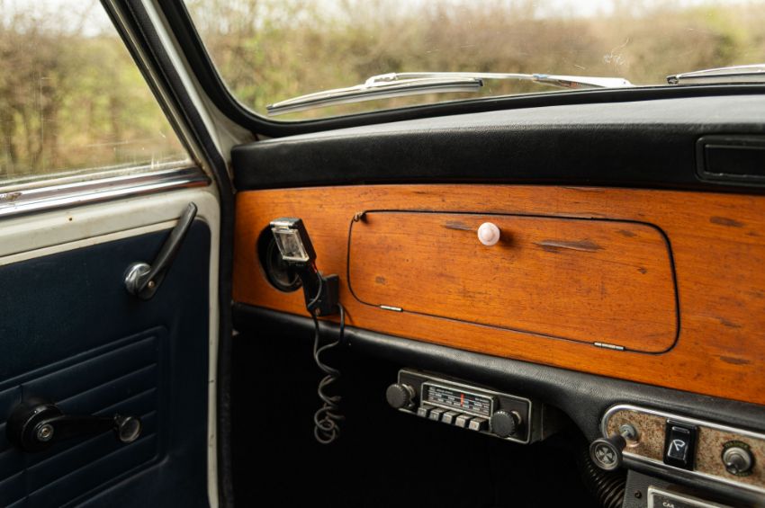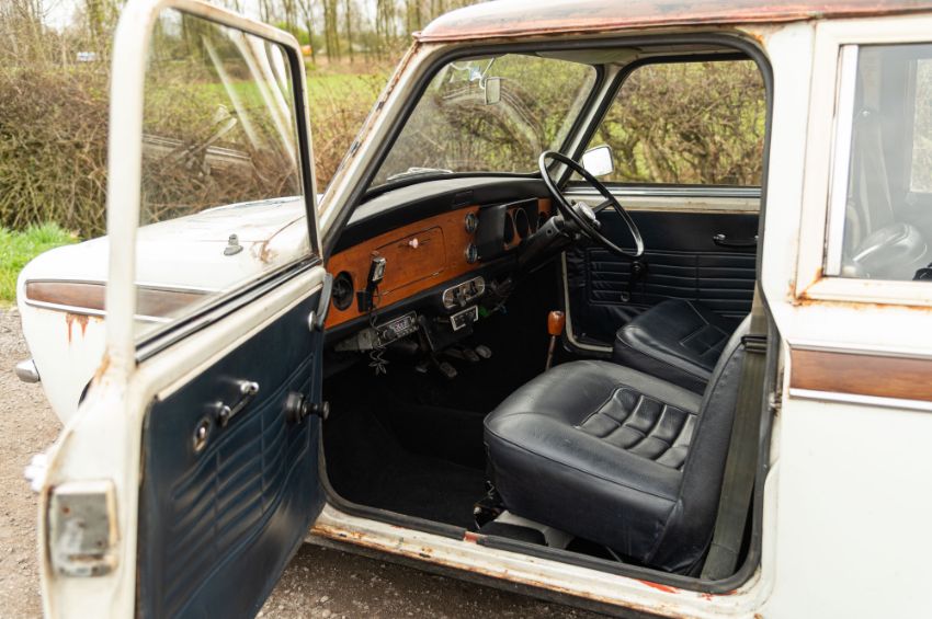 ‘EVP 281L’ still wears its original 1972 white livery complete with wood effect painted waist panels and roof. The car also features the signature Clubman chromed nose treatment with full width grill and integrated headlamps. This Clubman has purposely been left to reflect its long life and personality in full. As such there is plenty of surface corrosion, rust stained areas and even some thick blue paint on the bonnet as a reminder of some earlier vandalism. ‘EVP 281L’ is fitted with a set of silver painted Cooper reverse steel wheels and original chromed Clubman caps. The interior is finished in blue vinyl and is an architype of the Clubman cabin. The extra utility added by ‘EVP 281L’s’ estate configuration enhances this car’s rarity and popularity. The vendor confirms that ‘EVP 281L’ seems to draw far more attention at shows than more shiny, fully restored examples. Paintwork, bodywork and interior are all rated as “average.”