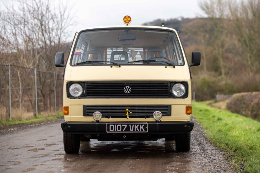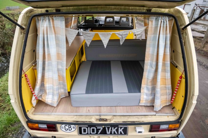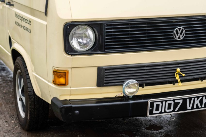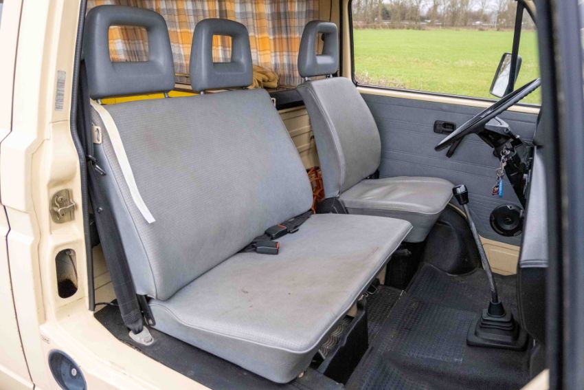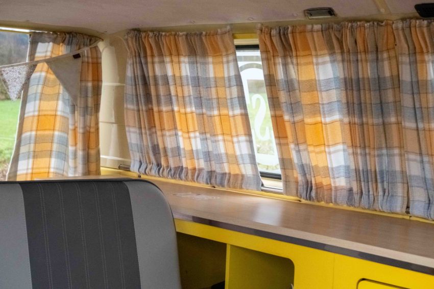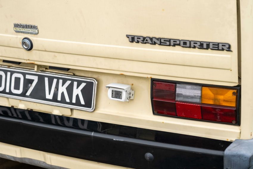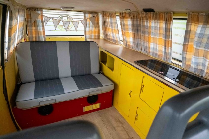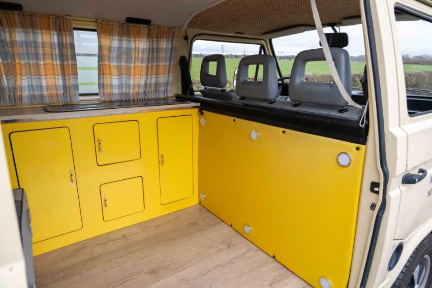 The camper interior presents well, with a neat and functional layout and useful storage, complemented by period style curtains and a fitted kitchenette unit. Additional details include auxiliary lighting to the front, the distinctive roof mounted beacon, and a modern rear view camera display integrated into the mirror, making this an easy and enjoyable classic to manoeuvre and live with.