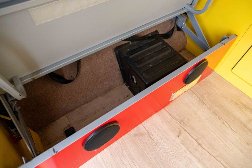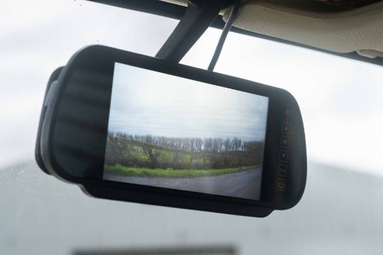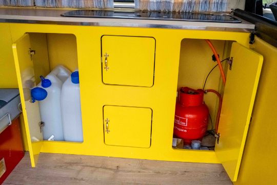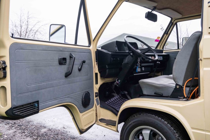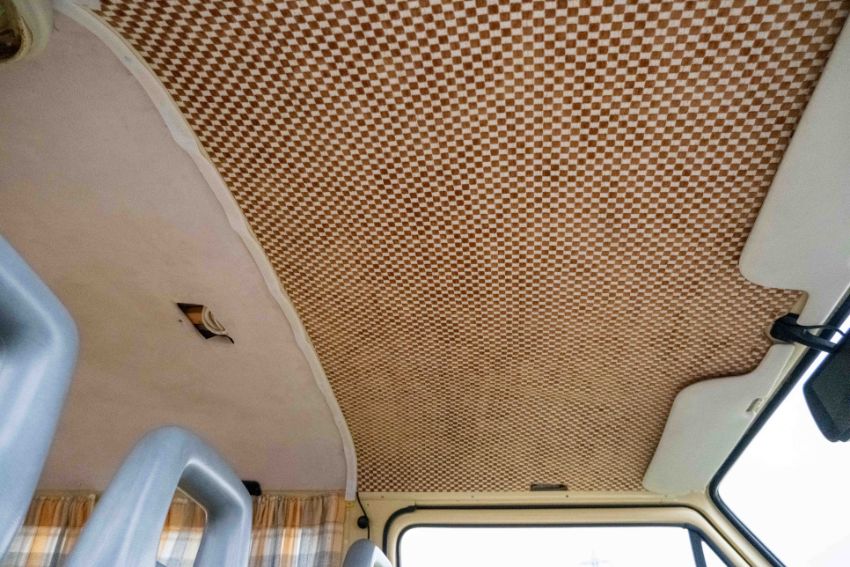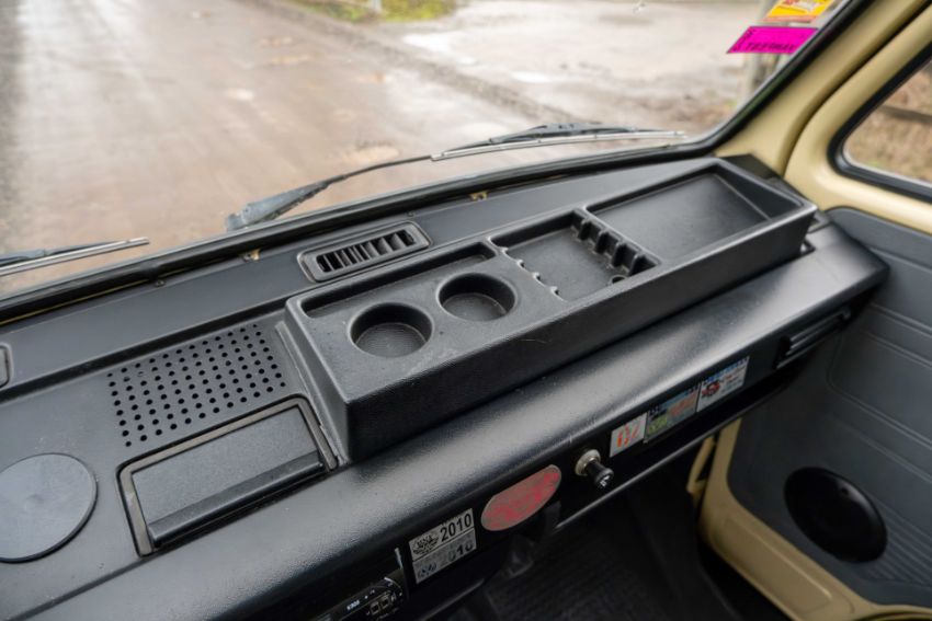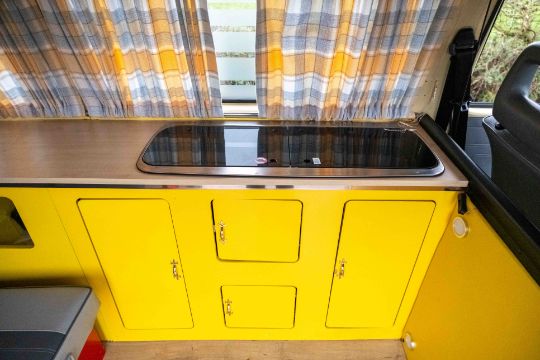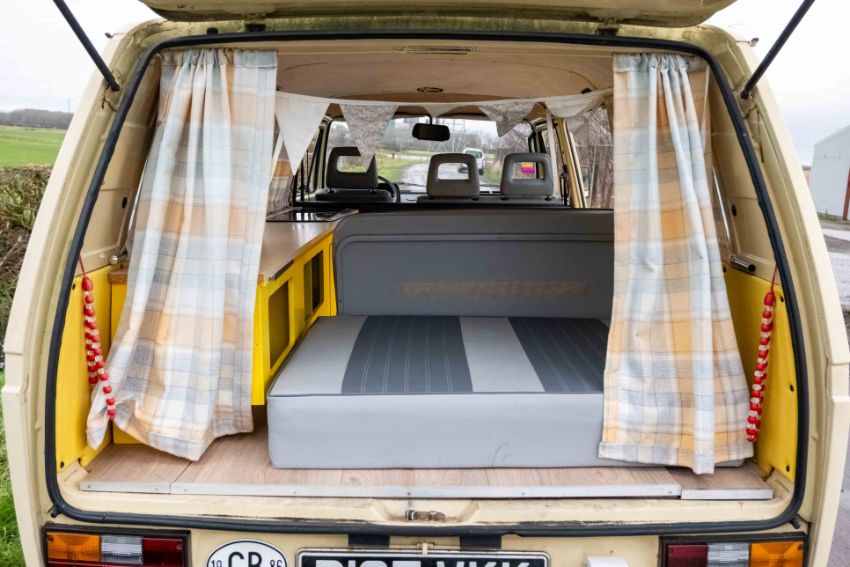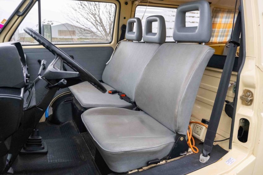The camper interior presents well, with a neat and functional layout and useful storage, complemented by period style curtains and a fitted kitchenette unit. Additional details include auxiliary lighting to the front, the distinctive roof mounted beacon, and a modern rear view camera display integrated into the mirror, making this an easy and enjoyable classic to manoeuvre and live with.