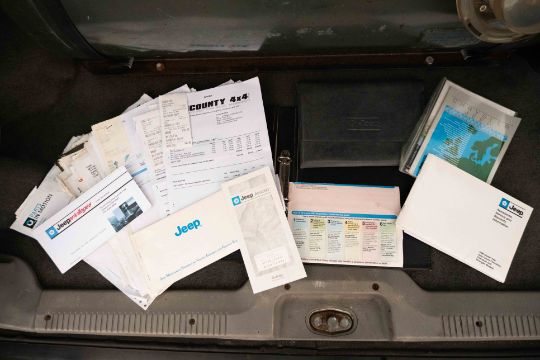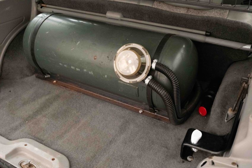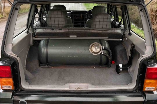 The interior retains its original period feel with wood effect trim and a robust dashboard layout, while the rear load area is fitted with a dog guard and houses the LPG tank installation. The vehicle is accompanied by a substantial history file, containing a quantity of invoices and supporting paperwork, along with handbook material as photographed.