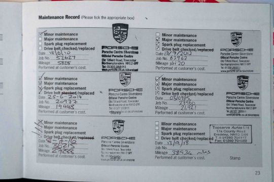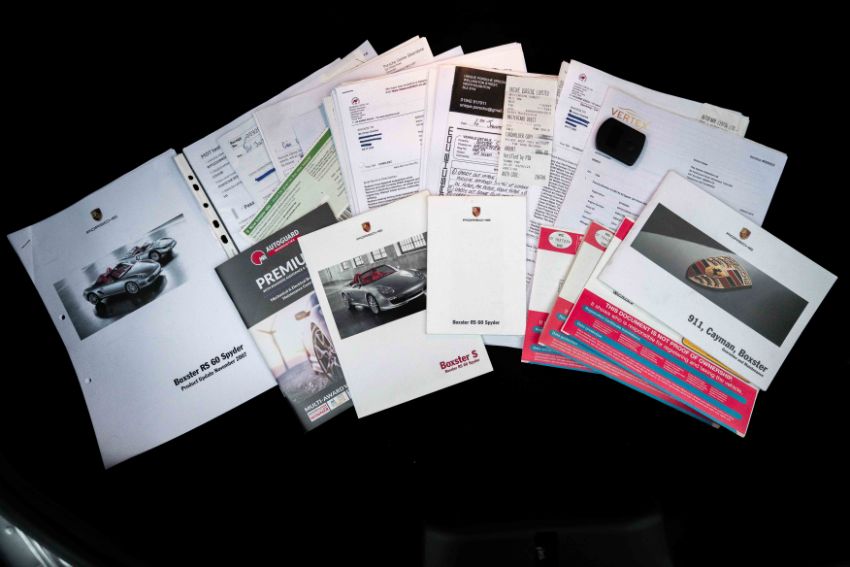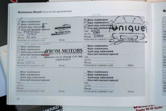 The accompanying service book and invoices show a strong maintenance record, initially with Porsche Centre Silverstone and more recently with respected Porsche specialists and marque-aware garages, with the most recent stamped service carried out in 2025 at approximately 59,972 miles. The odometer now reads 60,416 miles. The car is offered with its Porsche book-pack, RS 60 Spyder literature, assorted invoices and previous MOT certificates as photographed.